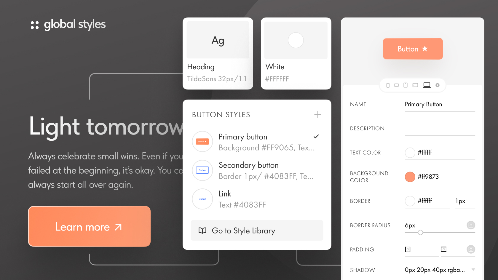 | | 🎄 Looking Back at 2025: Key Updates & News From Tilda | | This year brought a lot of long-awaited updates to Tilda—more possibilities for your projects, a smoother interface, and an easier website-building process. All releases are featured on a dedicated landing page—check it out to get inspired for new projects. Below you will find brief highlights from the past year. | | | | | | | | This year, Styles became available—a tool that helps you create and maintain your project's design system. Now you can customize the appearance of buttons and text, as well as the project's color palette, all in one place.